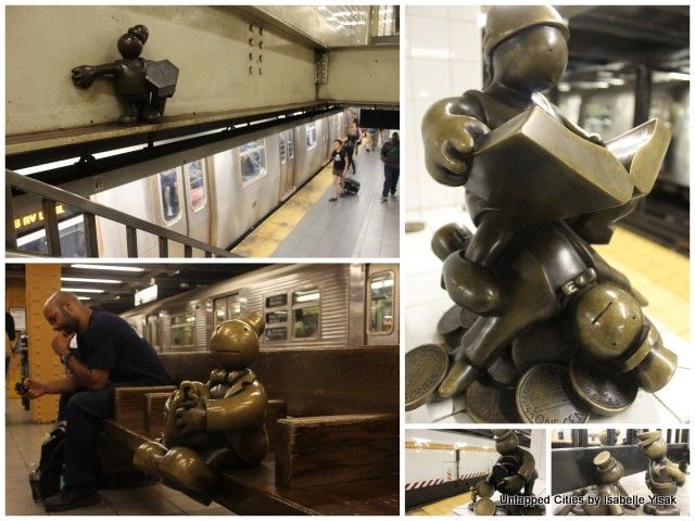 I have found that out of all the subway artworks, publications and other media outlets predominately feature Tom Otterness’s Life Underground. With figures that sit alongside commuters, scale the walls, and crawl under railings, I believe that their popularity lies in the fact that while travelers find these figures in abundance, some of them are placed in unexpected, out-of-sight places that when found. It’s like discovering buried treasure.