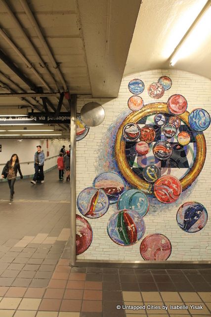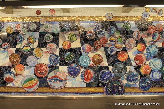 I wouldn’t guess that this mural, The Garden of Circus Delights, is partly a symbol for Dante’s Inferno, but artist Eric Fischl explains “I thought it would be amusing to do a contemporary Dante’s Inferno, to turn commuting into a spiritual quest.” The mosaic, with its fire-breathers, clowns, and other performers, accompanies travelers through this fantastical circus world. Moreover, the various shades of gold, red, and brown work together to create a contrast between the mysterious life of the circus and the plain, florescent-lit world of subway traveling.
