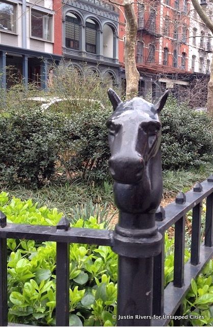 Duane Park is a small (barely one tenth of an acre) triangle surrounded by Duane Street to the north, south, and west, and Hudson Street to the east. The park was named after James Duane who helped draft the Articles of Confederation and was New York’s first mayor after the Revolutionary War. The land for Duane Park was purchased in 1797 for five dollars from Trinity Church and was the first parcel of land to be acquired by New York City with the intent of being turned into a public park. The park’s fence contains horse heads, whose origins are a mystery.