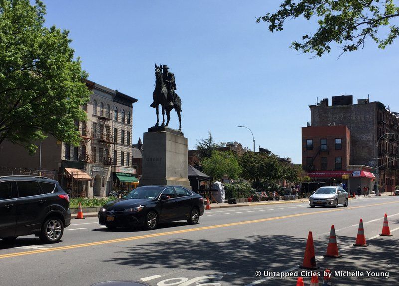 William Ordway Partridge, who also designed the statue of Samuel Tilden on Riverside Drive and Thomas Jefferson and John Howard Van Amringe at Columbia University, was chosen to by the Union League Club to design a bronze statue of General Grant. The statue was unveiled on April 27, 1896 on what would have been Grant’s birthday and the dedication ceremonies were led by Governor, and former vice president, Levi Parsons Morton and General Grant’s grandson. The 1,200 pound, sixteen foot, statue is located in what today is known as Grant Gore in Crown Heights though originally was referred to as Grant Square.