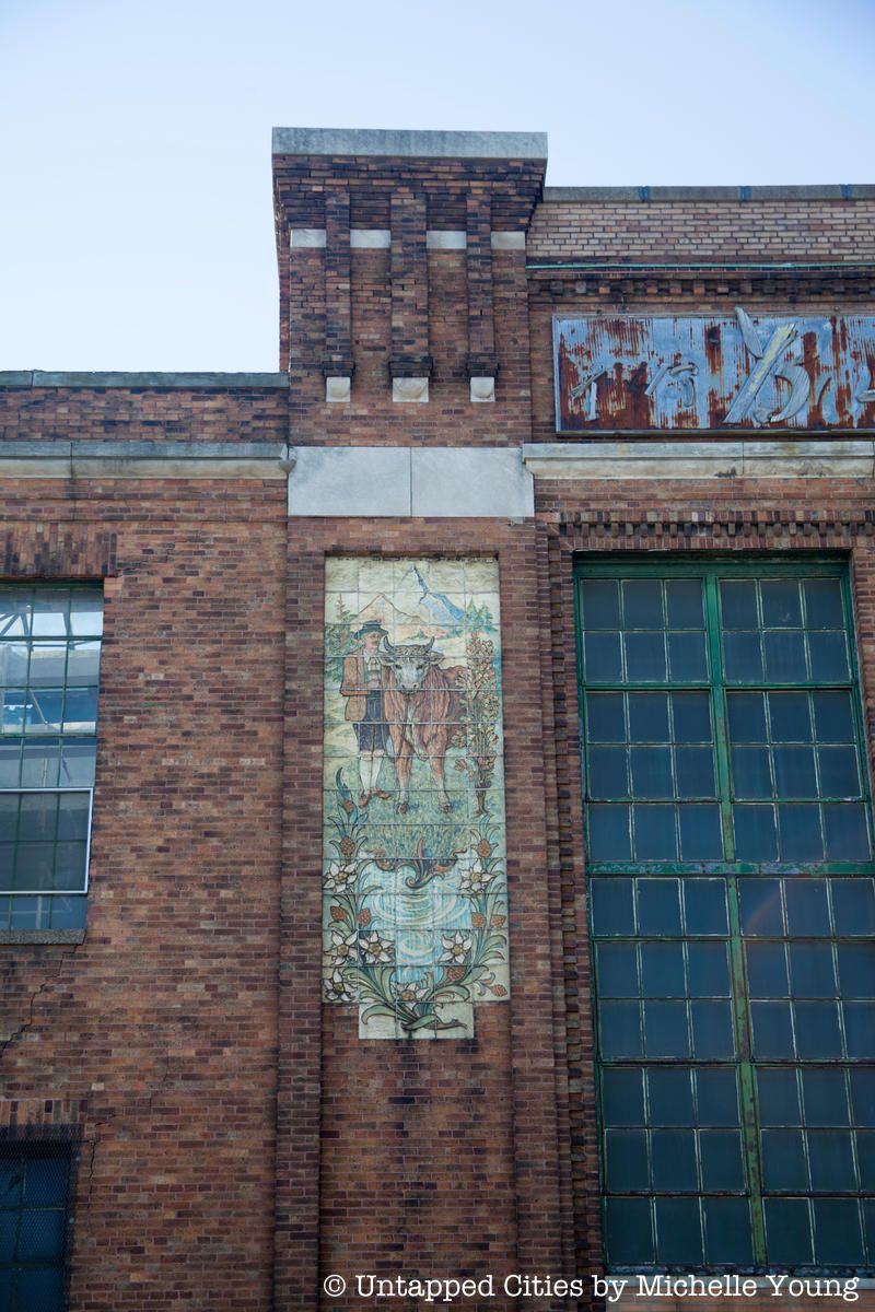 Even before the rezoning initiative was, however, underway, Michael Padwee, a historian and tile collector, has been fighting to save building since the 1990s. Built in 1914 when the company was known as Borden’s Dairy Factory, Empire State Dairy includes five buildings within a 76,375 square foot property. Of particular importance to Padwee is the presence of two vertical tile murals on the facade, a site-specific commission for the Empire State Dairy building and produced under the oversight of Leon Solon, the art director of the American Encaustic Tiling Company. The Ohio-based firm was once the largest tile producer in the world, with a showroom in midtown Manhattan. The company did experimental work for the first New York City subway line, and although it did not win the final bid (which went to Carrere and Hastings), some test tiles remained at the Columbus Circle station, revealed and shown to the public following a 2007 renovation.