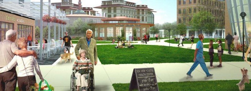 With a total of 90-acres, the new Sea View campus will integrate active design and healthy lifestyle options into the planning framework to improve access to physical activity, healthy foods, social engagement and healthy environments through medical, residential, and retail uses. New medical office space will add and improve to the existing Camelot and Grace Foundation facilities, while community farms and health food grocers, and farm-to-table cafes and restaurants will promote health lifestyles among the residents and visitors. Community areas and open spaces will have facilities and green spaces for hiking and biking, and the residential areas will serve as much needed housing for senior citizens and people with disabilities.