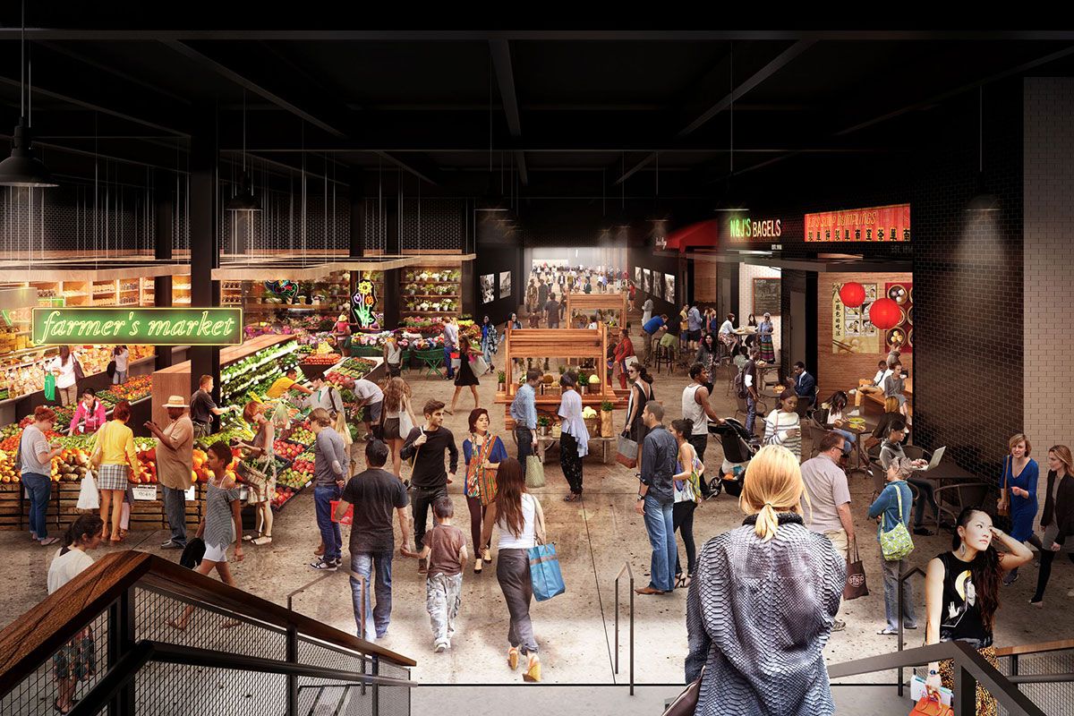 Rendering of the Market Line inside Essex Crossing. The space will have a light-scoop, a 40-ft tall glass wall that will bring natural light into the marketplace. Image via SHoP Architects.