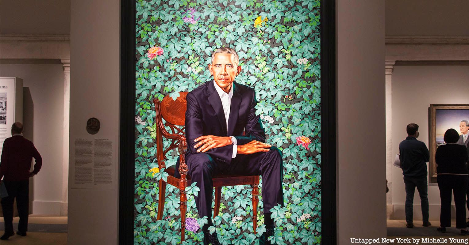Kehinde Wiley — whose hand-painted glass triptych named Go was created for the ceiling at the West 33rd Street entrance of Moynihan Train Hall and has a painting which uses Jacques-Louis David’s portrait of Napoleon as a starting point in the Brooklyn Museum— painted the oil-on-canvas portrait of President Obama, which depicts him in front of a backdrop of leaves and flowers. Obama stares straight at the viewer with his arms crossed, and the foliage is symbolic of Obama’s life: jasmine references Hawaii, where Obama was born; African blue lilies represent Kenya, Obama’s father’s birthplace; and chrysanthemums are the official flower of Chicago, where his political career began.