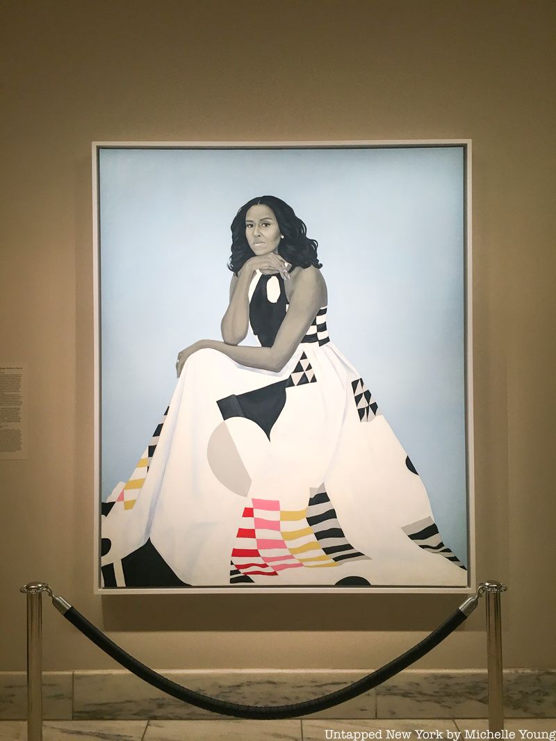 Amy Sherald painted the oil-on-linen portrait of the former First Lady. Michelle Obama gazes directly at the viewer, with her hand under her chin. She sits in front of a light blue background, and her patterned dress hints at modern influences like Pop art as well as the African-American quilt tradition.