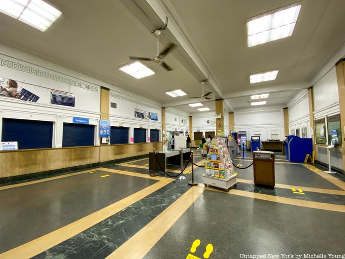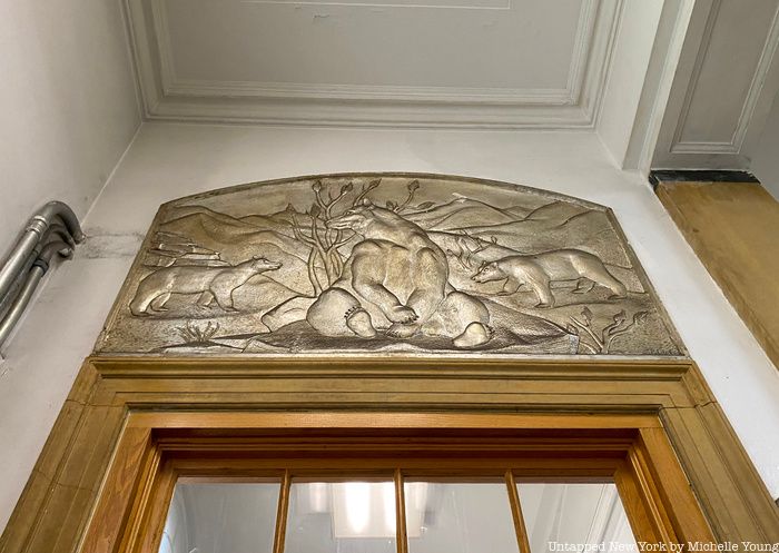The mail trucks at the Old Chelsea Post Office leave from arched brick entranceways along 18th Street and you’ll regularly see mail trucks going in and out. While the interior of the post office is not necessarily ornate, a certain level of care was paid to the design. The floor features multiple types of stone, laid out in rectangular sections that help delineate the space. A geometric, meander pattern near the ceiling rings the lobby, much like a frieze on an ancient Greek or Roman temple. Above the doorways are bronze bas relief art works by Woodstock-based artist Paul Fiene showing woodland scenes. One is entitled “Deer” and the other “Bear.”