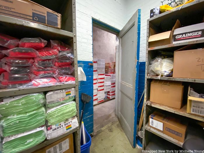 The pneumatic tube remnants are located pretty deep in the post office. It’s not in a publicly accessible area, but I was taken down into the basement, through a cage full of janitorial supplies and into a narrow hallway filled with forgotten office supplies. At the very end were six flanges coming out of the wall.