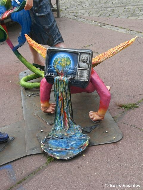 Sculptures of the WTF variety: a gaudy vomiting TV gremlin.