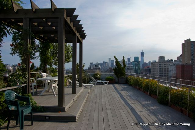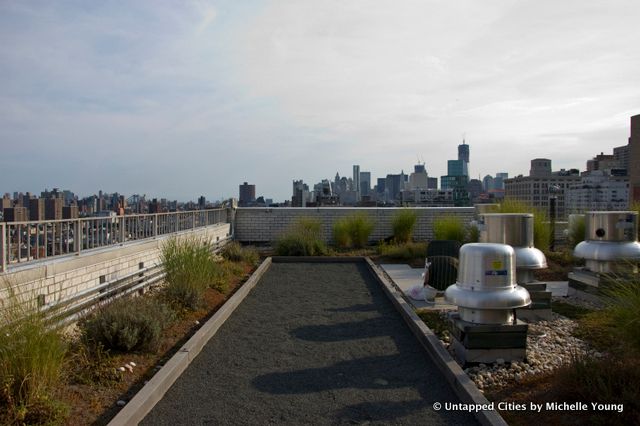 To get a better idea of what green roofs are and do, we toured a roof in the East Village with Christian Toebe of Greensulate, a company specializing in green roof design and construction. The building he showed us was a private co-op, one where the board decided opted to go green and provide roof access for tenants, instead of paying for a regular roof fix. Exiting the staircase to the roof we were surprised to find a quiet patio and garden, where residents can escape to relax, read or play bocce.