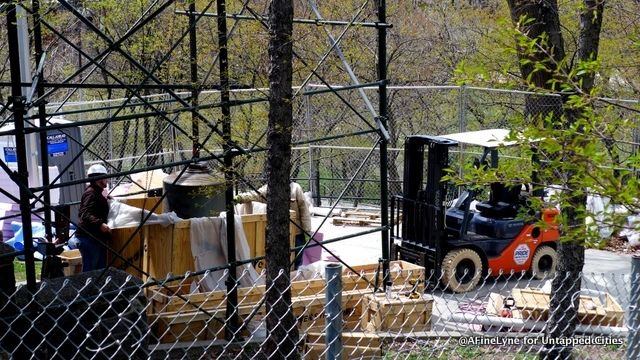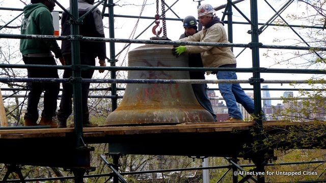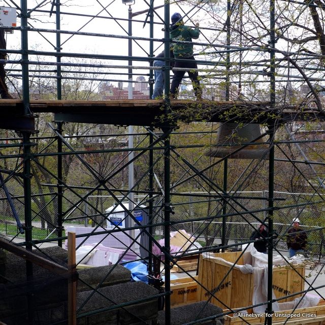 Earlier this year we watched as the scaffolding went up on the only surviving watchtower in Manhattan. The Harlem Fire Watchtower, built between 1855 and 1857, is located in Marcus Garvey Park at the end of Fifth Avenue on 120th Street in Harlem. Over the course of the last few month, the tower, including the 10,000 pound bell, was taken down. The following are photos we took over the past few months, during the dismantling.