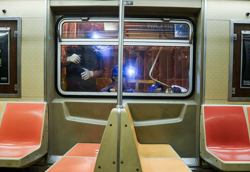 In addition to the R46 cars, orange seats can also be found inside R62, R62A, R68, and R68A cars. These models arrived in the 1980s and are slightly different than the R46 cars. Both are missing the faux wood and New York City seal wall covering and the R62s don’t have that all-important window seat.