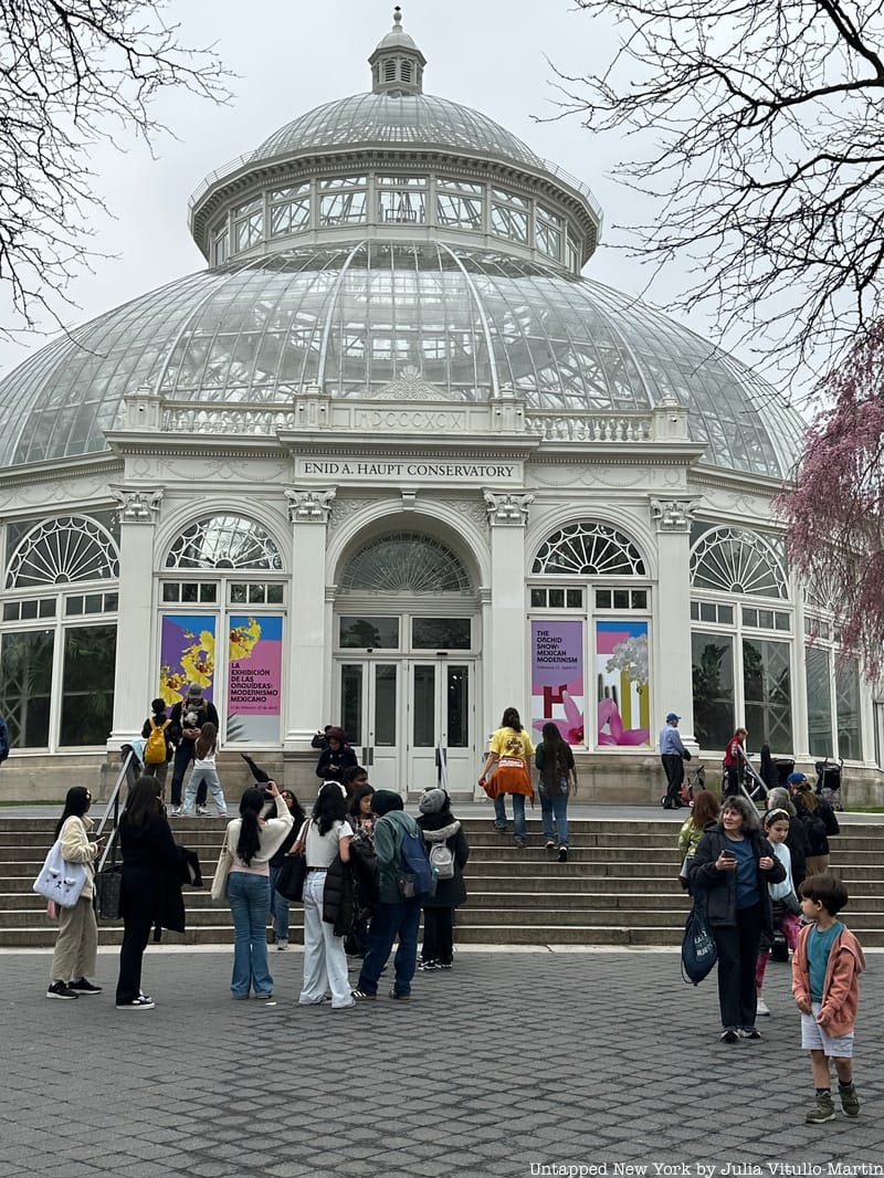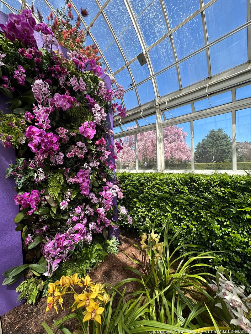 Orchids bloom inside the Enid A. Haupt Conservatory and weeping Japanese cherry trees, Prunus pendula, thrive outside
