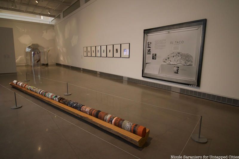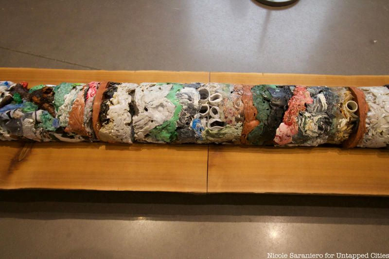 Inside the main gallery space where you will find pieces from the Time Travel category, one piece that sticks out is Clarissa Tossin’s Future Fossil. Tossin was Inspired by the science fiction writing of Octavia Butler. The artist imagined what types of layers would make up a fossil found after an ecological collapse on Earth. She used her own plastic waste for a large portion of the fossil.