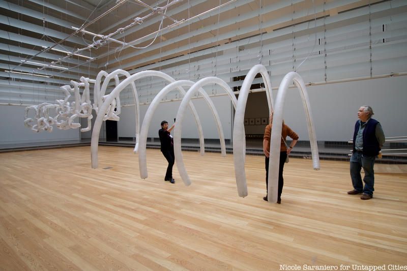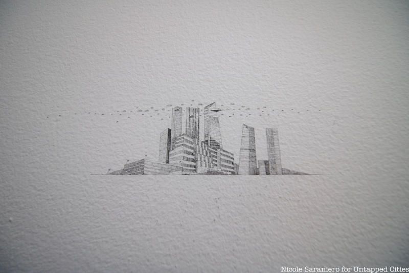 Surrounding the MacMutrie piece is a new site-specific work by Glexis Novoa from the Alternate Americas category entitled Emptiness: Queens Museum. Across the expansive white walls of the lobby, Novoa drew minuscule versions of futuristic skylines. Novoa was inspired by the museum itself and the history of the site as fairgrounds for the 1939 and 1964 World’s Fairs. Looking at the drawings, you can recognize certain New York City sites like Hudson Yards and the New York State Pavilion, but with slight fantastical alterations.