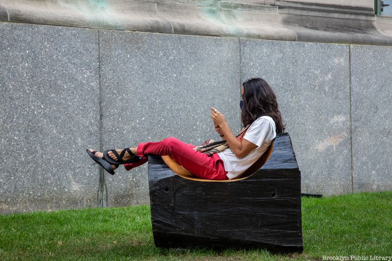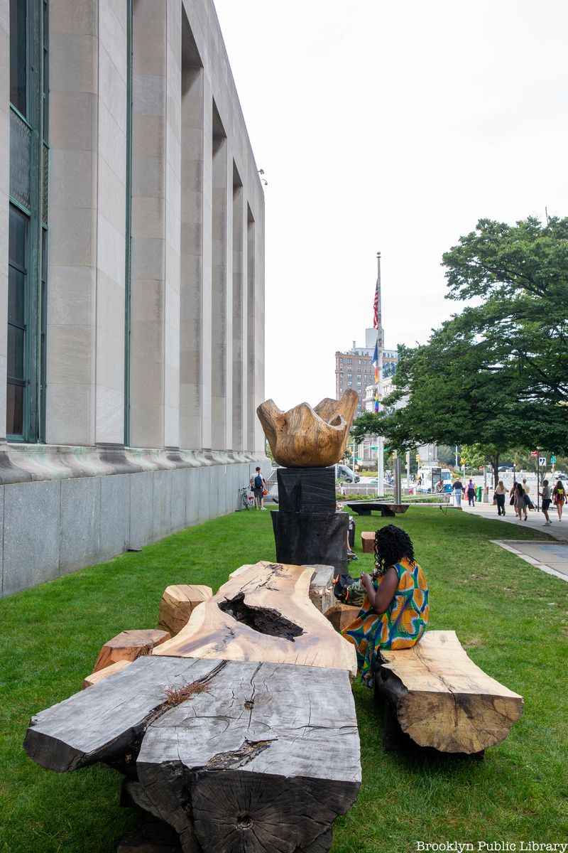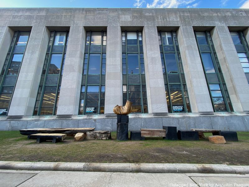 At the Central Library of the Brooklyn Public Library at Grand Army Plaza, the outdoor reading room is particularly unique, designed by artist Heinrich Spillman. The seating is all made of wood reclaimed from landfills are saved from destruction by woodchippers, with the majority of the wood sourced from Green-Wood Cemetery. The wood comes from a variety of tree species and according to the library, are “treated by fire scorching, using the ancient Japanese technique of Shou Suji Ban, with wood sealers and/or clear varnishes or are intentionally left exposed to the decaying elements of nature.”