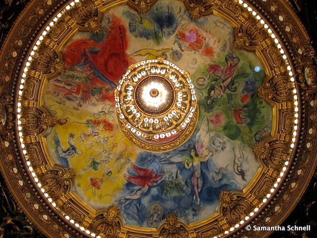 It was a fair point—I’ve never been a huge fan of naked cupids and tambourines—but I had to disagree. I liked that the Palais Garnier was over the top; it was opulent, magnificent and thrilling. When I entered the grand foyer a few weeks later, having scored a ticket to the ballet, I felt as though I had transformed into an elegant opera-goer from the 19th century. I could have sworn there was a horse and carriage waiting for me outside, even though I was wearing sneakers and jeans. I walked up the great, yawning staircase and emerged into the auditorium, where everything was gilded and sumptuous. Looking up, I gazed at the colorful dome painted by Marc Chagall; hanging from its center was a giant bronze and crystal chandelier which, at seven tons, weighs roughly the size of an elephant. I couldn’t help but think of the famous scene from The Phantom of the Opera, set in the Palais Garnier, in which the chandelier comes crashing down.