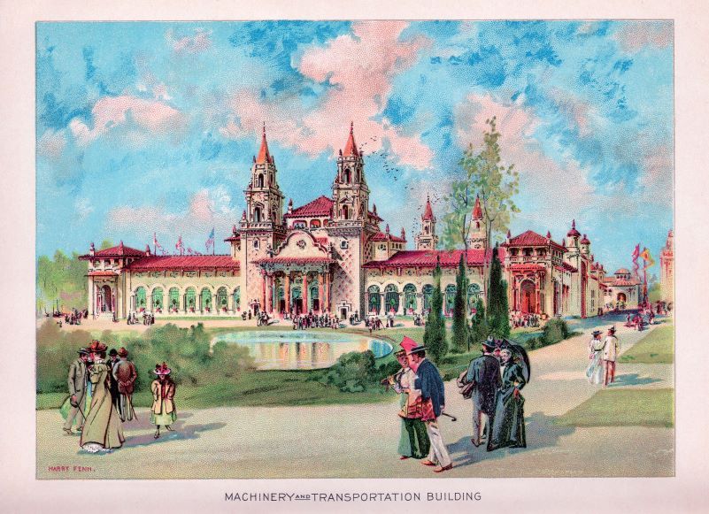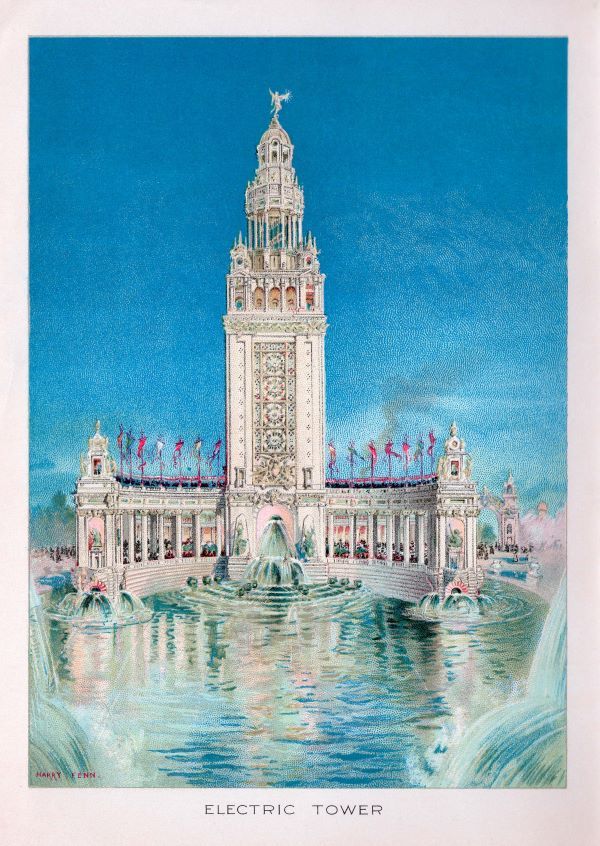 But the symbolism expressed through color did not stop there. As a visitor entered and then progressed through the exposition grounds, the colors selected for the structures implied a story of inevitable evolution. Early buildings, such as the Horticulture and Government buildings, wore a bright palette of “primitive or primary colors.” But Turner noted that as one moved further into the grounds, “the decorations become more sober.” The evolutionary tale told in color culminated with the Electric Tower, which Charles described as “a harmony of green and gold on an ivory ground.”