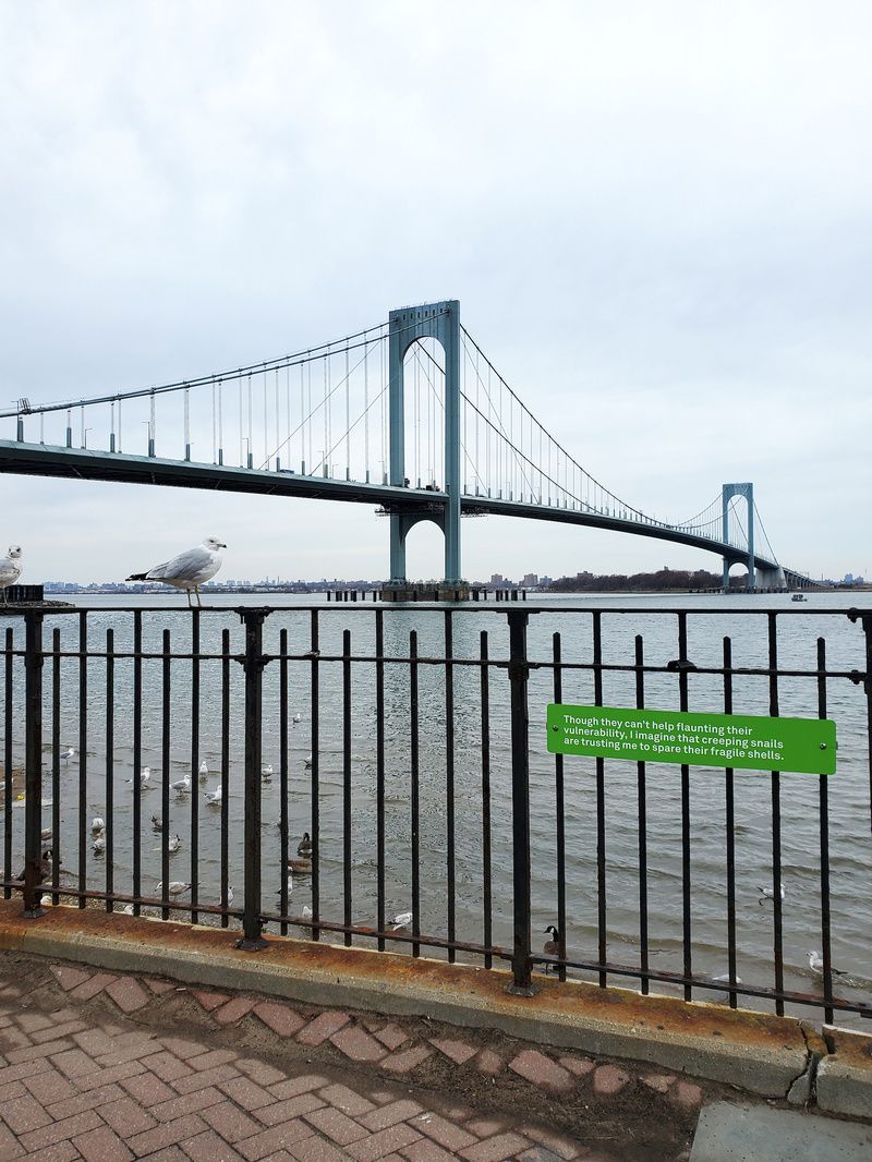 Park Poem installations will remain on view for about one year after debuting. The five poems and parks that are part of the program this year include “Twilight” by W.S. Merwin at Clason Point Park, in the Bronx, “I Was Never Able to Pray” by Edward Hirsch at Valentino Pier Park in Brooklyn, “Oscura luz / Dark Light” by Francisco X. Alarcón (Spanish/English) at Sunken Playground in Manhattan, “我坐在這裡 / I Sit Here” by Liu Xia (Chinese/English) at Clove Lakes Park in Staten Island, and “Six Tankas” by Harryette Mullen at Francis Lewis Park, in Queens.