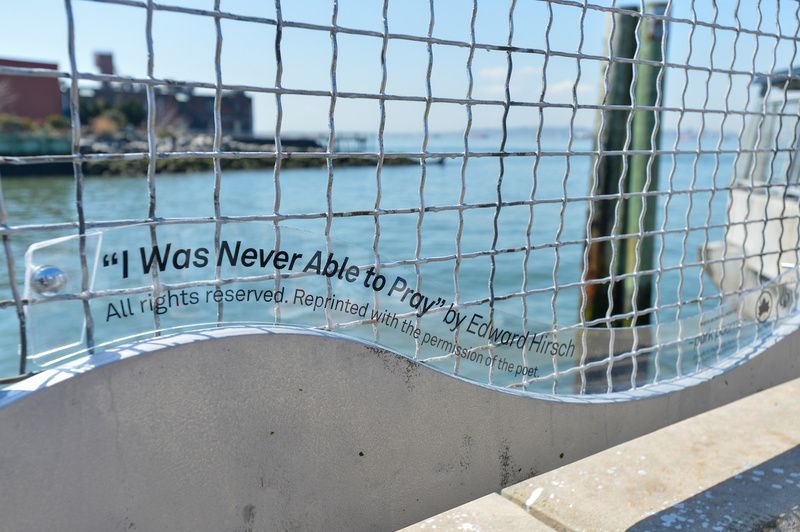 Hirsch did a reading of his poem “I Was Never Able to Pray,” which now appears on undulating see-through plaques along the pier, overlooking New York Harbor and sites like the Statue of Liberty. Before the unveiling, students crafted poems of their own, arranging stanzas out of park-themed Velcro word sets