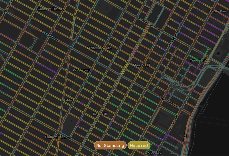 What also sets WXY’s map apart from the existing DOT Parking Sign map is that this data can be understood at a glance. A color key on the left side of the WXY map groups the city’s many different regulations into high-level categories that are each assigned a color. By clicking on a specific regulation in the key, you can instantly see the curbs it applies to highlighted in the assigned color on the map.