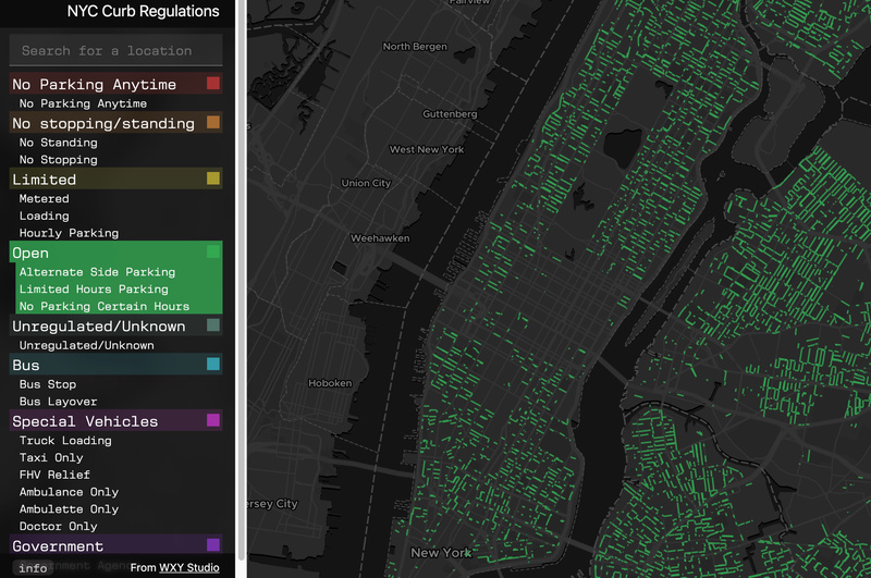 A design-forward interactive map by WXY Studio shows the parking rules along every stretch of curb in New York City!