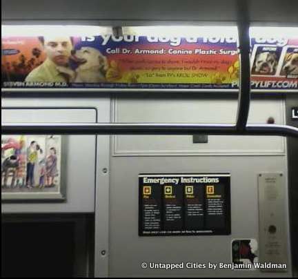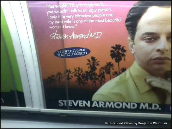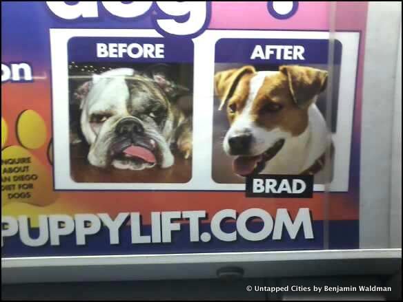 Untapped Cities writer Benjamin Waldman snapped these photos of a parody Dr. Zizmor ad in the New York subway today on the E train. A quick check of the website puppylift.com reveals the source: Dr. Armond aka Nick Kroll on Comedy Central! The famous, long-running ad is recreated–font, colors and layout. But tag line is now “Is your dog a total dog?” and in place of Dr. Zizmor is Dr. Armond with a golden retriever licking his face. The before and after photos show a bull dog transformed into a Jack Russell terrier. In place of the success quote from Dr. Zizmor is Armond’s supposed quote: