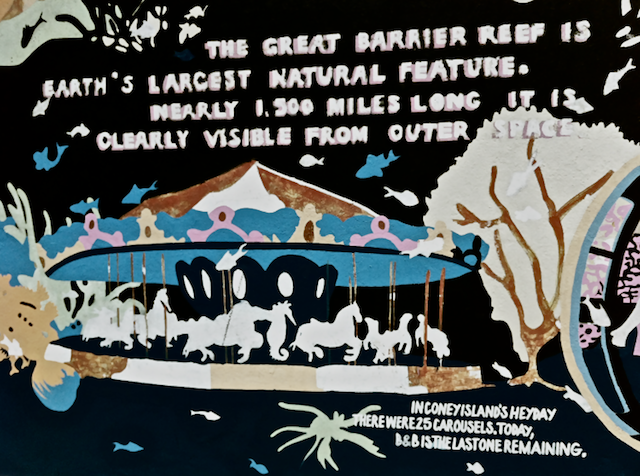 Then, in an apparent declaration of war on the citizens of New York, the city sent the carousel to Ohio. Now don’t worry, it didn’t move there to retire modestly and slowly waste away (like many New Yorkers). The city of Marion just happened to house the shop of one of the last experts in the meticulous art of carousel restoration. The B&B Carousell would be put on the proverbial operating table aside 50 of its closest hand-carved animal friends, and be given new life. That was over four years ago. Now, the only evidence that remains of B&B in New York is an old wall mural featuring the carousel below a thematically similar think piece on the Great Barrier Reef.