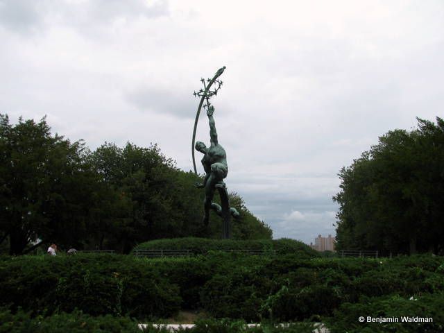 Donald DeLue said that his sculptures were “intended to last for thousands of years.” Unfortunately, time has not been kind to his most famous sculpture, The Rocket Thrower. The sculpture is one of the 40 locations in this year’s Partners for Preservation, a community-based initiative by American Express and the National Trust for Historic Preservation. As New York City’s first-ever citywide grassroots preservation effort, the call-to-action program will enlist the aid of all New Yorkers, and anyone who loves New York, to vote online to allocate $3 million dollars to the preservation projects most important to them. The Rocket Thrower Conservation hopes to apply a new patina, re-gilde the constellation, repair cracks to the sculpture and its base, and apply a protective coating of wax to the sculpture so that it will shine once again.