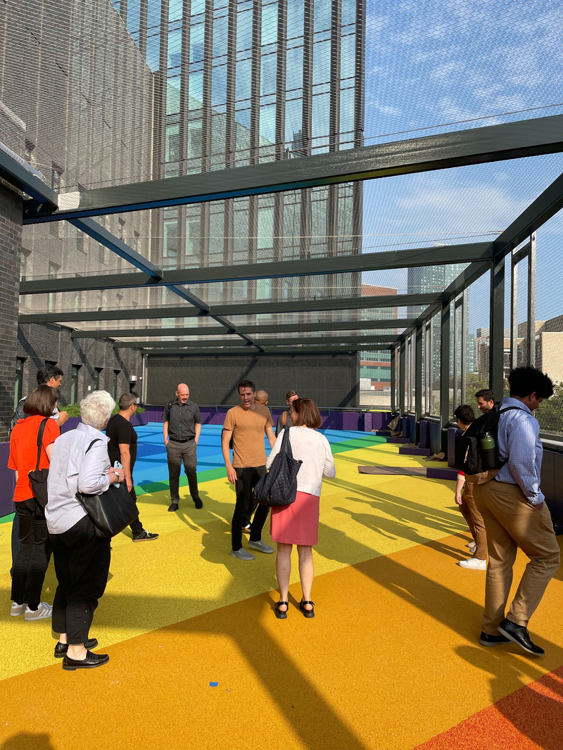 Walking through the hallways, it’s hard to believe the school sits on Flatbush Avenue, the busiest corridor in the city’s most populous borough. That was Alloy’s motivation behind its Passive House design; it insulates students from noise, pollution, and potential intruders. During a site visit of the property, Jared Della Valle, the project’s principal developer, explained that the building is configured to safeguard against the threat of a school shooter. This disquiets the tour, as if coming to terms with this harsh reality.