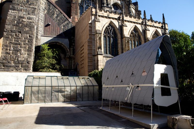 The peacocks lived in a custom-designed hutch built in 2017. The hutch was designed by Ryan Lewandowski and Paul Scrugha, winners of a design competition by Ennead Architects, and meant to compliment the gothic architecture of the cathedral. The new hutch was blessed in an outdoor ceremony by The Right Reverend Andrew Dietsche, Bishop of the Episcopal Diocese of New York.
