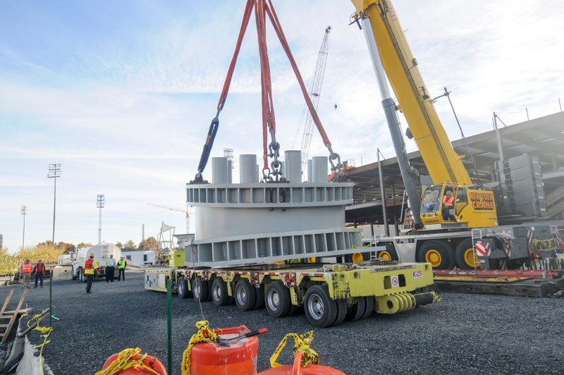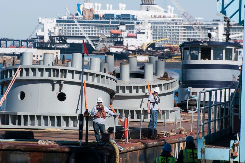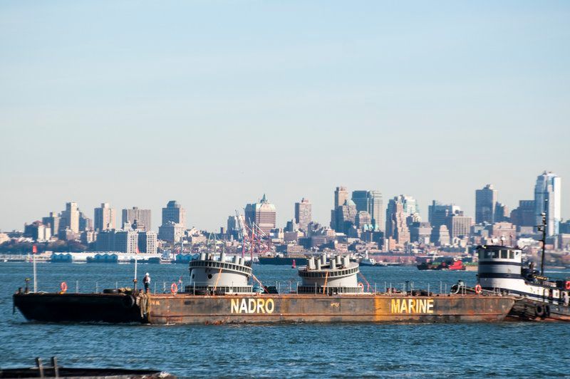 At the beginning of October, we went to photograph the arrival of the legs of the New York Wheel, which will be the largest ferris wheel in the world when completed. Those pieces were delivered to the South Brooklyn Marine Terminal but last week, the pedestals arrived directly to the Staten Island construction site by barge from Montreal. The scale of this project is quite stunning, with each leg weighing 500 tons and each pedestal at 100 tons.