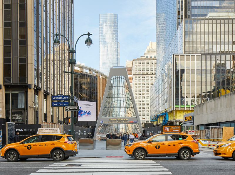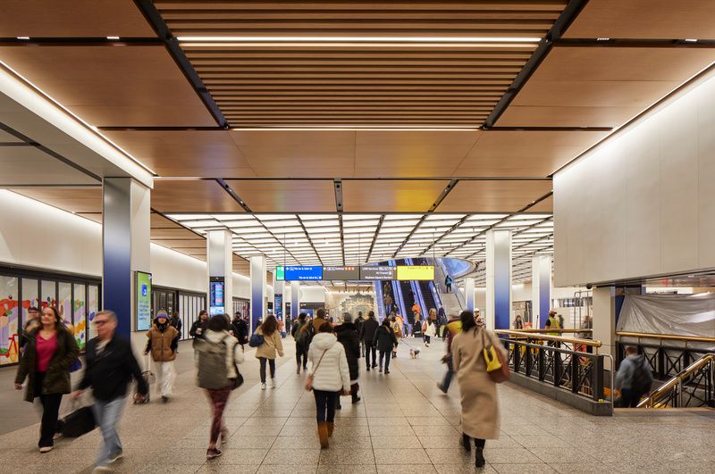 Inside the station, translucent panels backlit by LED lighting illuminate the concourse from above. The light panels double as a wayfinding tool, marking the concourse’s intersections. Surrounding the East End entrance, the shape and arrangement of the light panels are reminiscent of the geometry of Moynihan Train Hall’s skylight across the street.