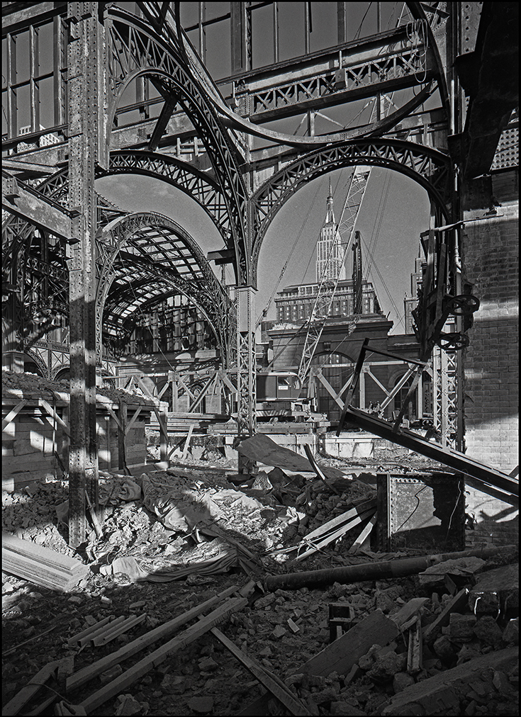 During the demolition period, I was working in the Pennsylvania [Hotel], so I had views that were hard to photograph. The photograph of the station’s roof, which, architecturally, is arguably the most interesting and effective part of the building, shows the glass and steel roof that went unnoticed by visitors. A lot of my photographs, although some have people in them, many don’t. That wasn’t by design. It was simply because there was no work going on. I would have liked to have included them (people) because it offered scale. It’s one of the reasons that many of my photographs have Aaron Rose in them.