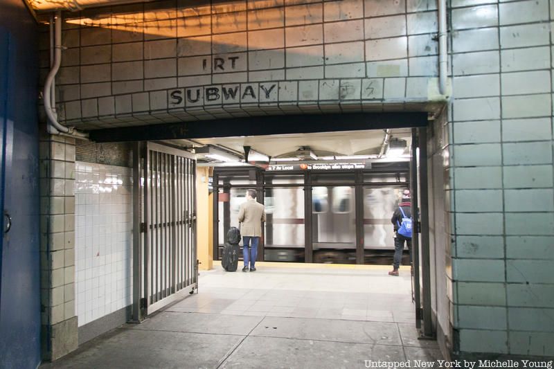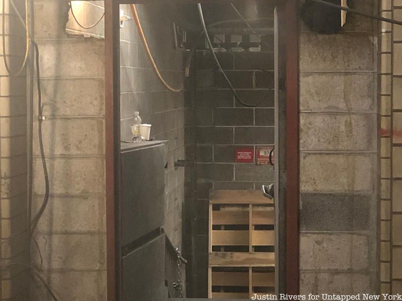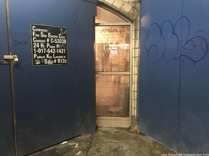 Another doorway you can see to the left of the photo above we believe would have led into the Baggage and Parcel Carousel Office, where commuters could store their luggage. This space was used as office space for the bar Tracks. The point of view from which our photos were taken is where the tunnel would connect to the 1/2/3 subway, a branch of the IRT line, built around the same time as the original Penn Station. Untapped New York was able to peek into the hallway through a gap in the construction fencing, at the top of the staircase to the downtown 1 train.