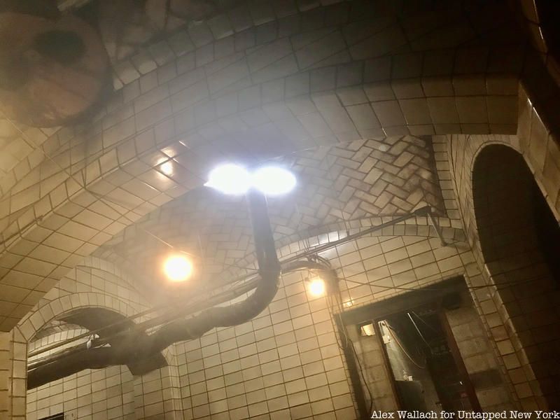 The hallway entrance has been blocked off since the 1980s and the tunnel is usually dark. For some reason, likely so that the MTA can use the tunnel for access during construction, lights have been installed and turned on to illuminate the hallway, revealing the arches and tile work which have been obscured to passersby. The top of the passageway features Guastavino vaulted ceilings, an architectural feature that was common in the original Penn Station designed by McKim, Mead and White. In the original station there were giant Guastavino arches in the glass filled main concourse. According to Maggie Redfern and John Ochsendorf, authors of A Guide to Guastavino in New York City, this is the last example of Guastavino tile work in the entire station. Our Chief Experience Office Justin Rivers, who checked out the tunnel after we got a tip that the lights were on, says the vaulted ceiling probably provides a similar acoustic effect as the whispering gallery in Grand Central Terminal.