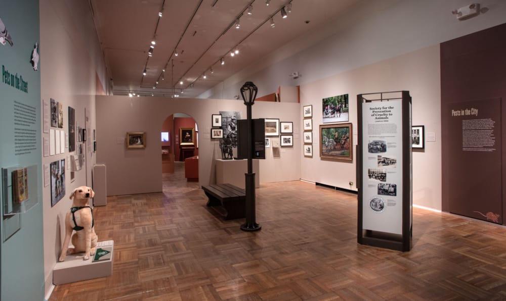 In addition to adorable paintings and photographs that show children and adult pet owners fawning over their companions, there are displays about working animals of modern times. The exhibit sheds light on helpful creatures like the messenger pigeons of World War I, Seeing Eye dogs, carriage horses, bombing sniffing canines, and more.