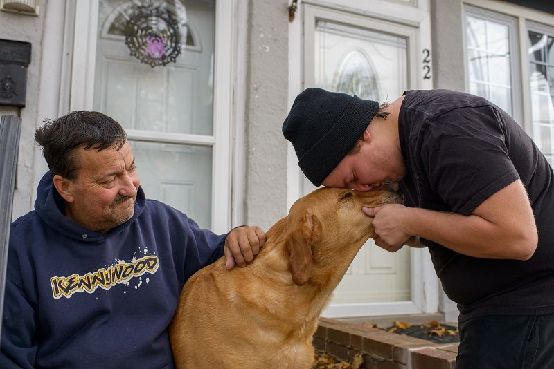 Dominic Anderson, 20, with his dad, Walter John, 60, and dog, Paddy at their home on November 3rd, West Brighton, Staten Island. Dominic comes from a traditional Irish Catholic Staten Island Family, his dad served in the NYPD for 20 years and is now retired, his mom supports his family by working four jobs. Photograph by Gareth Smit.
