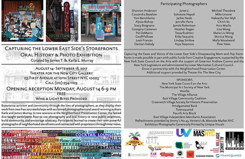 “Capturing the Lower East Side’s Storefronts Oral History & Photo Exhibition” is now on view through September 18th at Theater for the New City Gallery, 155 First Ave. on 10th Street.