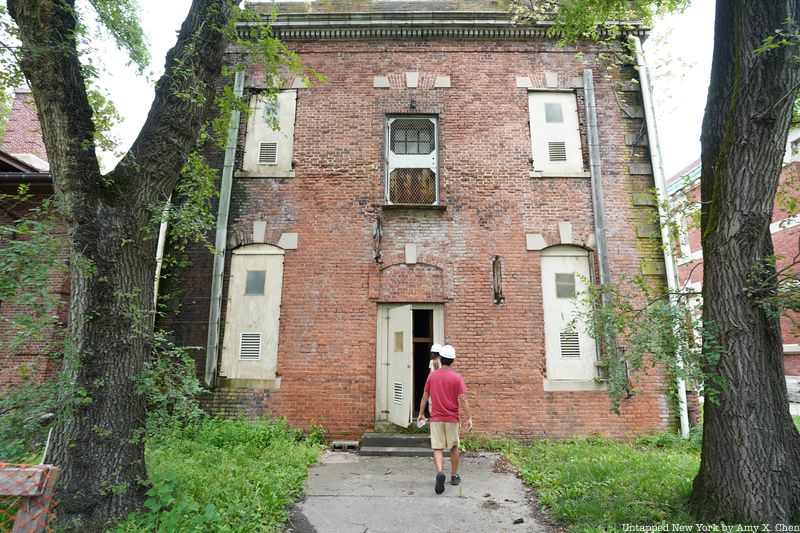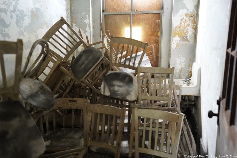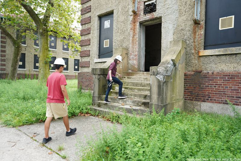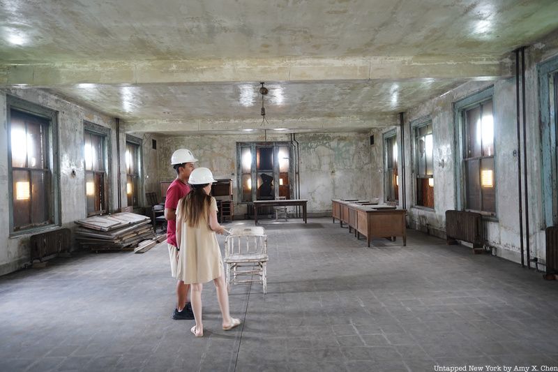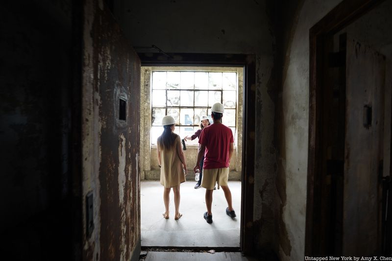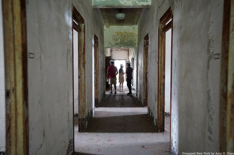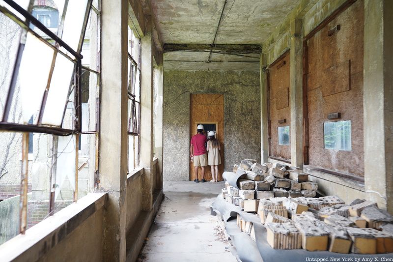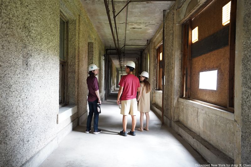 Before heading into any abandoned areas, you’ll pick up and put on your hard hats inside a restored part of the Art Deco Ferry Building. The 1936 structure was designed by Charles Delano of Delano and Aldrich. It connects the main registry building to the hospital campus. Long left in ruin, the building was reopened in 2007 after a $6.4 million restoration.