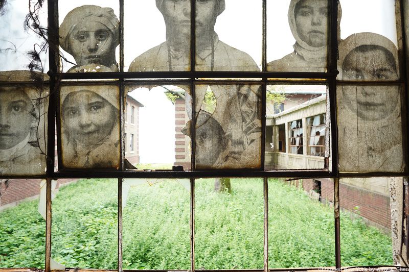The installation is site-specific, taking cues from and incorporating elements of the buildings themselves. In the photo above, the hospital kitchen’s oven hood once stood in for the hull of the ship in the pasted photo. In the former laboratory building, a large image of what the interior once looked like is pasted on the walls.