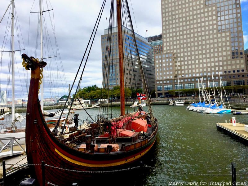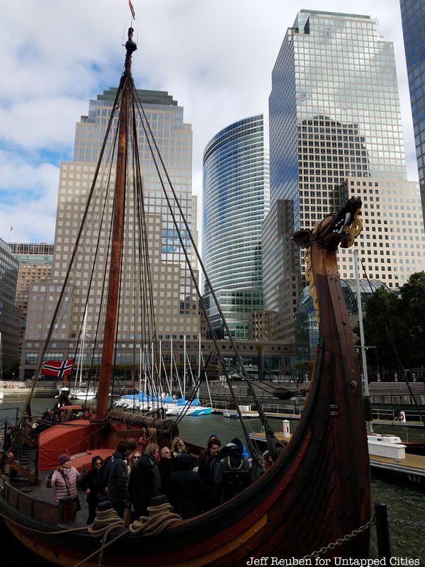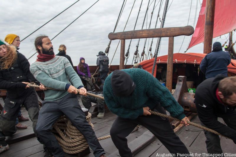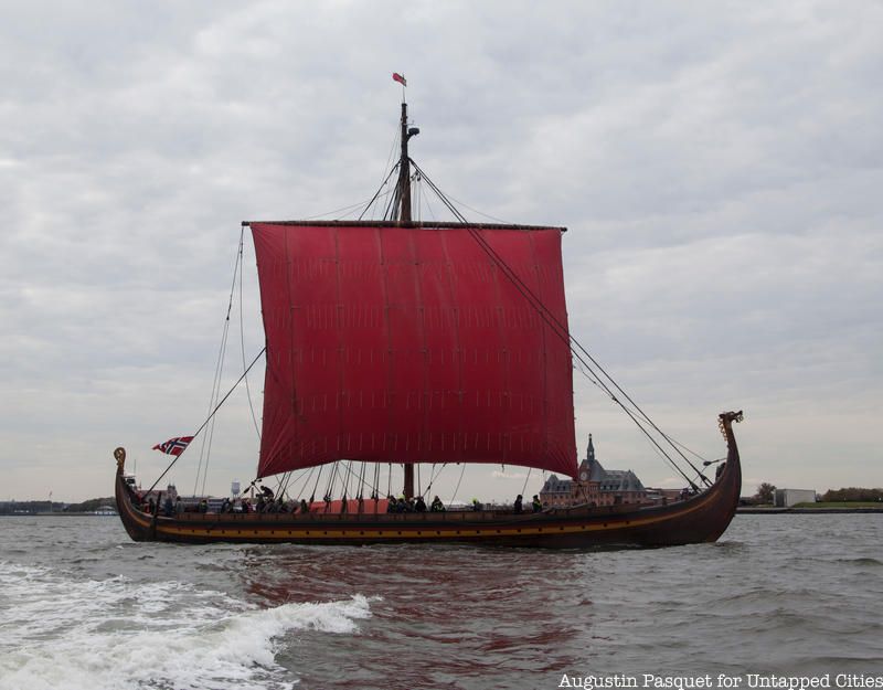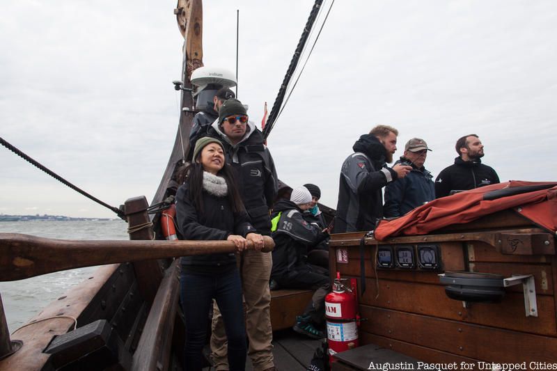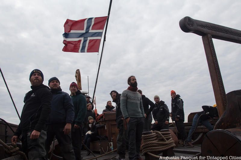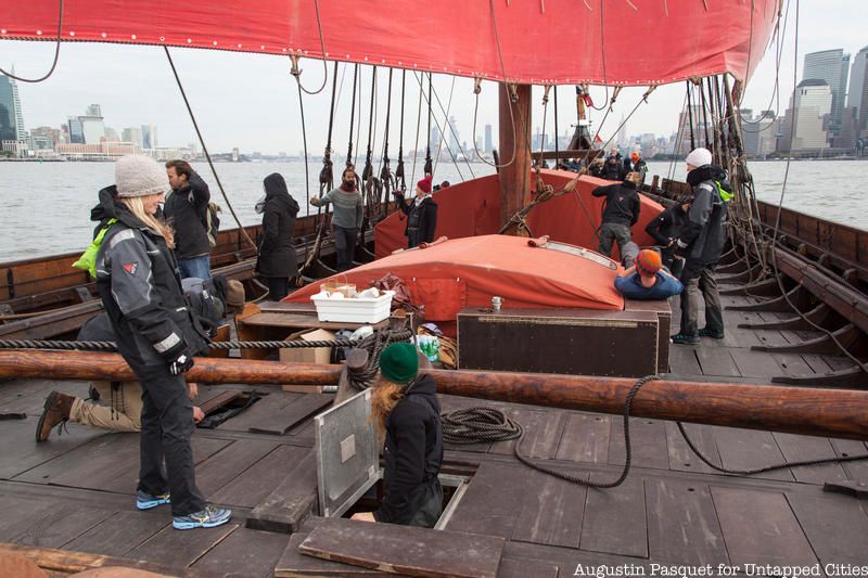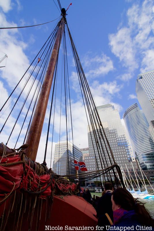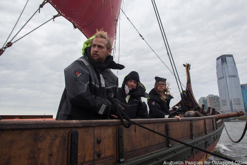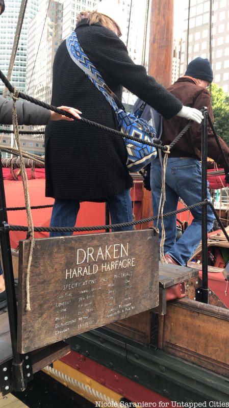 The Draken Harald Hårfagre, a 115-foot long wooden Viking ship, spent the last few days of its East Coast American Expedition docked at New York City’s North Cove Marina and Untapped Cities Insiders were invited on board! You too can gain access to free behind-the-scenes like this one by becoming a member today. Insiders braved the wind and cold of a brisk Sunday morning to meet the crew on a private deck tour and to get a taste of Viking life aboard the Draken, the largest ship of its kind built in modern times, and our Untapped Cities team got to go for a sail courtesy of Highland Park, a whisky distiller from the Orkney Islands in Scotland, a place with Viking roots.