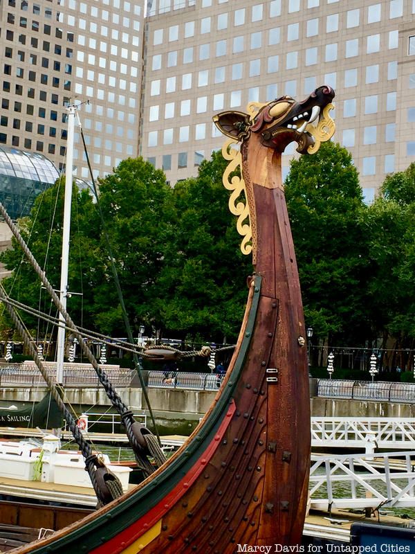 The towering mast of the Draken, its ornamented wooden hull, and dragon headed bow were an incongruent site to see against the backdrop of Lower Manhattan skyscrapers and modern sailing vessels docked alongside it in the marina. The Draken was built by historians and craftsmen in Norway, between 2010 and 2012, based on research from archeological digs, Norse legends, visual and foreign accounts of Viking boats, old sailing records, and Norwegian ship building know-how. The Vikings themselves didn’t leave any written records of their ship building techniques. It is not a replication of any one specific ship, but a reconstruction of what Norse Sagas refer to as a “Great ship.” The route of the ship’s East Coast American expedition followed the historical route sailed across the Atlantic Ocean by the Vikings that led to the discovery of the Americas more than 1,000 years ago.