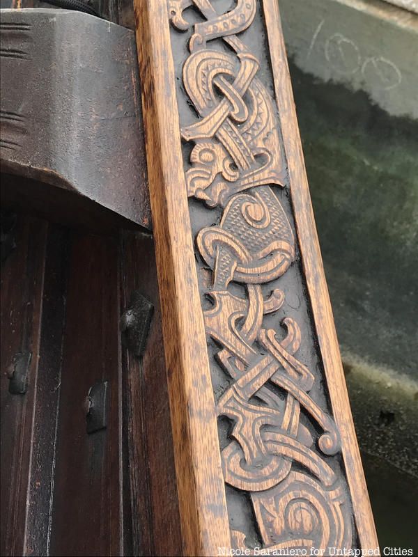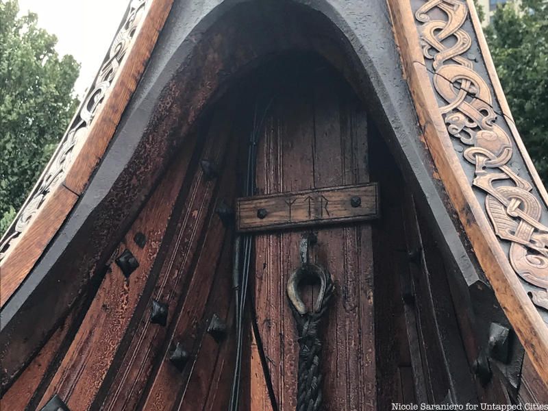 Walking along the ship you notice ornamental patterns and symbols intricately carved into the wood. These patterns were inspired by those found on excavated Viking ships. Attached to the bow is a small piece of ash, a symbol of the Norse tree of life, with three runes carved into it. These runes stand for protection, strength and communication, essential qualities for survival at sea.