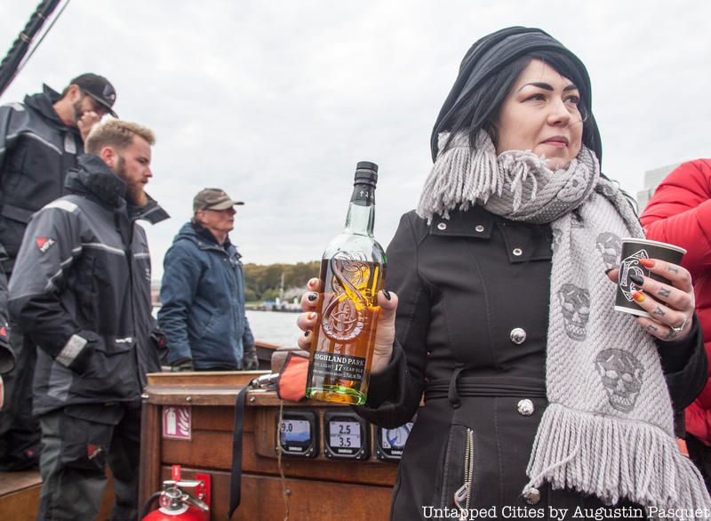 Ahlander even allowed the Untapped Cities to pilot the boat through the far less rough waters of the Buttermilk Channel between Governors Island and Brooklyn. Monday’s sail took us from Brookfield Place Marina to the Statue of Liberty, up the Buttermilk Channel, within view of the Brooklyn Bridge and back. After the sail, the Untapped Cities team was treated to tastings of Highland Park’s whisky, made on the island of Orkney in Scotland, which was originally settled by Vikings. We tried the Valknut, a special edition single-malt whisky, part of a series designed in partnership with Danish designer Jim Lyngvil called Viking Legends, inspired by the rich Viking heritage and mythology of Highland Park’s Orkney Islands home. The word Valknut means “knot of those slain in battle.” We also tried The Light, a 17-year-old single-malt Scotch whisky released in summer 2018.