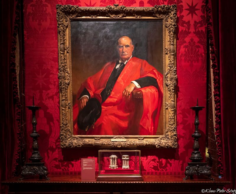 Above the fireplace, there is a massive tapestry called The Triumph of Avarice. It was designed by Pieter Coecke van Aelst and woven in the workshop of Willem de Pannemaker in Brussels. Dated to 1545, the tapestry is one of a series that depicts the Seven Deadly Sins and it once belonged to Henry VIII.