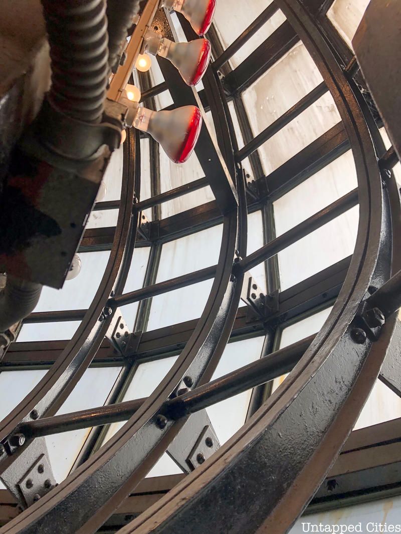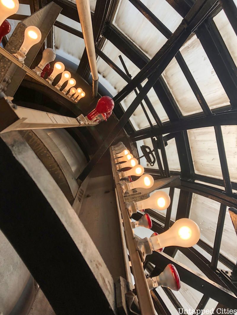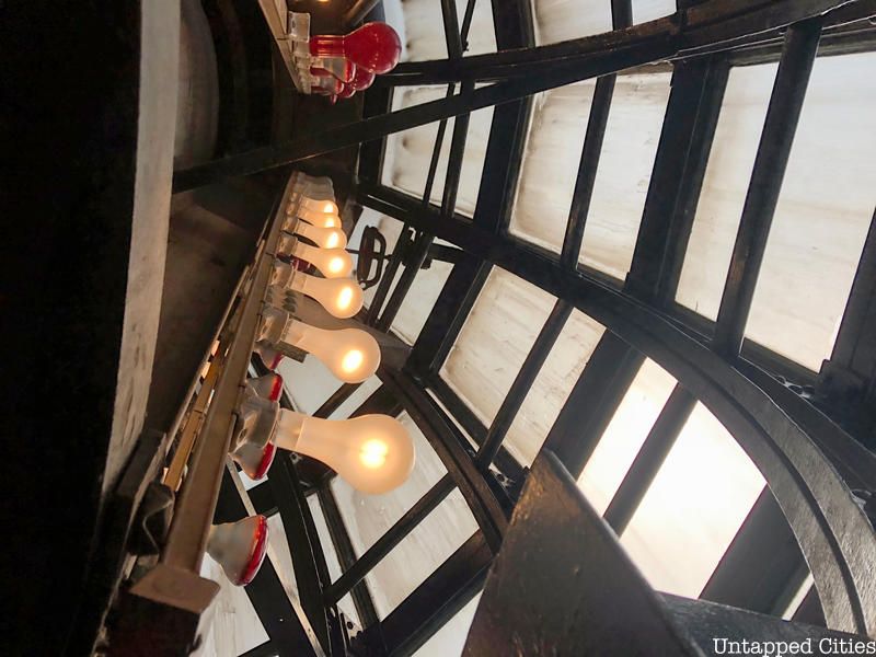 Anonymous urban explorers recently shared the below photographs inside and atop the globe and clocktower of the Paramount Building taken sometime in 2018, telling us that while it was exhilarating to finally get up to the narrow open-air walkway around the globe, the way up was hot, stuffy, and cramped. “A single ladder attached to the wall gets you up to one landing (with nowhere to fall but flat on your back) and then you have to squeeze your body into the globe between the lights, and lift yourself into the opening onto the walkway. Definitely would not recommend it for casual explorers.” This description makes sense according to what we know about the history of the Paramount Building. These upper levels were never constructed as an observation deck, unlike other Art Deco skyscrapers like 70 Pine, the Woolworth Building, the Chanin Building and others.
