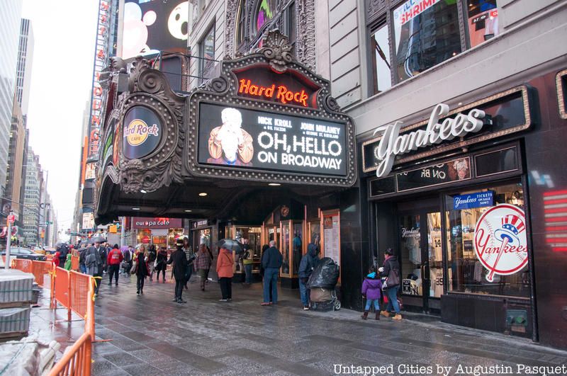 The French-style theater played host to stars like Frank Sinatra, Dean Martin, Buddy Holly, Jerry Lewis, Benny Goodman, and Jack Benny. It also was the site of the world premiere of Elvis Presley’s first movie Love Me Tender. Between 1966 and 1960, the theater was demolished when the building was converted into offices and retail. The marquee and arched entranceway that exists along Broadway today is in fact a recreation from 2001 by architecture firm Tobin Parnes, and the globe and clock were restored in 1997 by Spectacolor Communications. The entrance of the building was moved around the corner last year from Broadway to 44th Street.