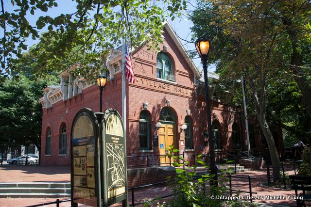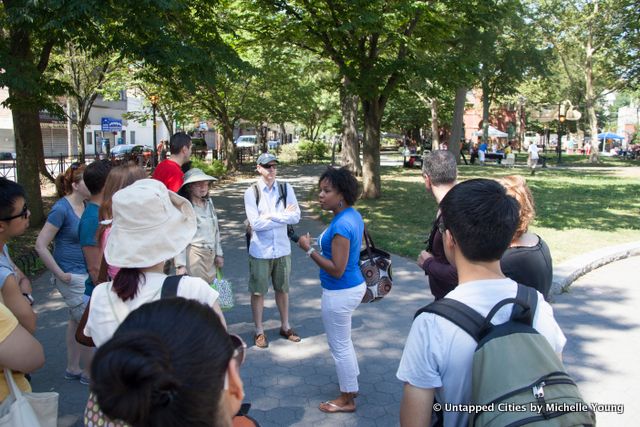 Tappen Park is the second oldest park on Staten Island, and Kamillah Hanks walked us around the weekend bazaar being set up by local residents, along with the historic buildings within and adjacent to the park. “You can still sense a community here,” noted one of the guests of the former shopping district, just before a notable Staten Island musician in the park nearly pummeled a tour-goer with a bear hug. Part of that community sense may derive from the urban planning of this neighborhood, one of the few designed as a traditional town square. Inside the park, the red brick Village Hall was once the courthouse for all of Staten Island’s north shore and DeFonte’s Pizza of Brooklyn has taken up residence on along the park–a sure sign to many of what’s coming.