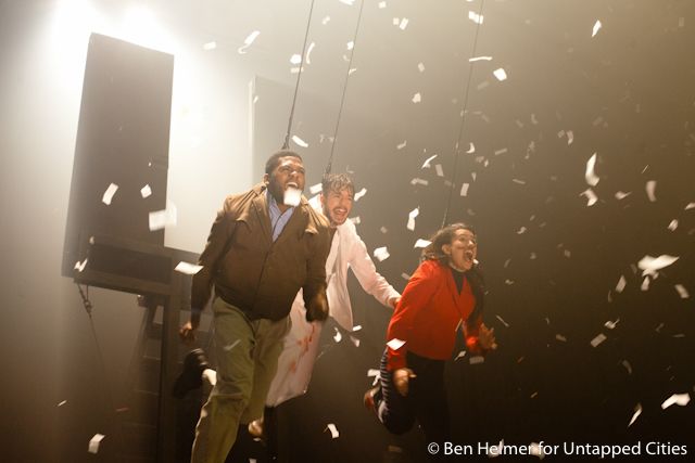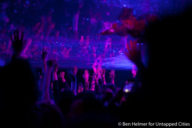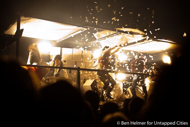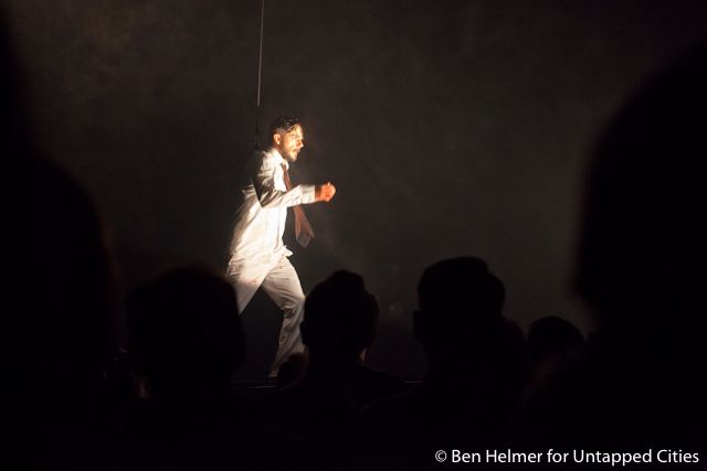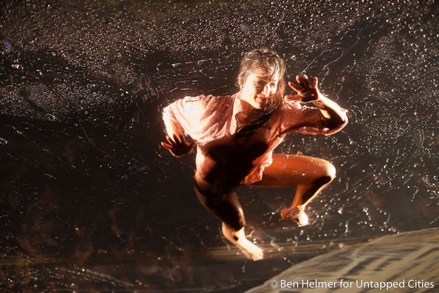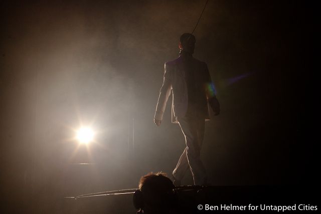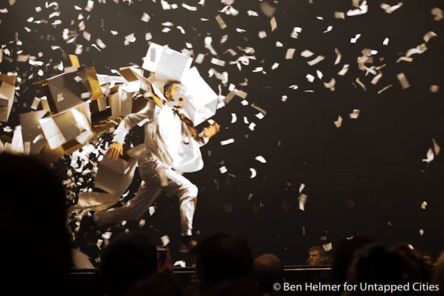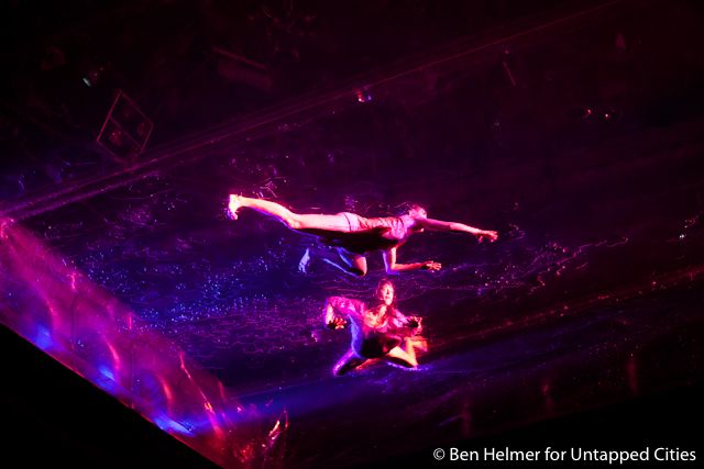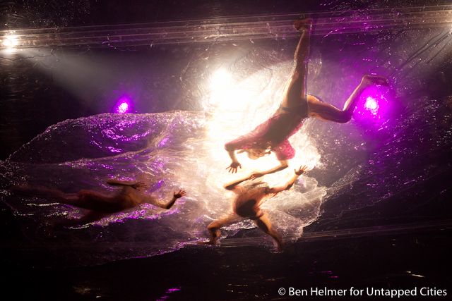 If you haven’t seen the interactive spectacle Fuerza Bruta in action yet, it can be hard to describe. It’s sort of like dreaming while you’re awake. The show is closing permanently on January 5th, so we took our awesome photographer Ben Helmer in tow so we could attempt to capture the show’s penchant for water dancing, trapeze art and frequent use of confetti. Fuerza Bruta has been playing in the Daryl Roth Theater since 2007, an noble piece of architecture that served as the Union Square Savings Bank until 1996.
