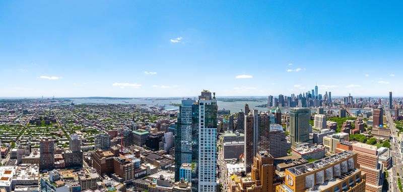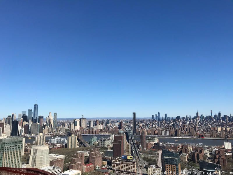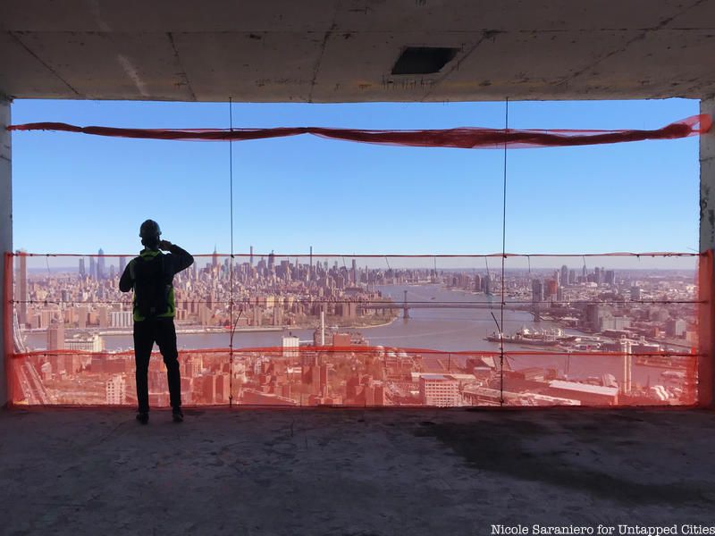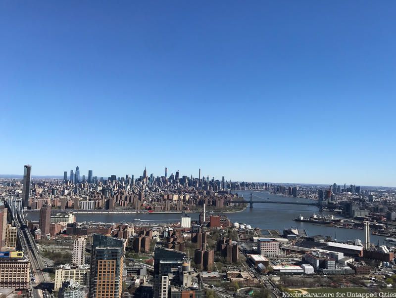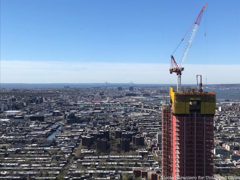 At the topping out event on Tuesday, Untapped Cities got to take in all of the views from the 63rd floor of the new structure designed by KPF Architects. Ari Alowan Goldstein, Senior Vice President of Development at Extell, pointed out features of the new building and landmarks you can see from the upper floors. To the north, there is a sweeping view of the Manhattan skyline from the Queensboro Bridge down to the World Trade Center. You can clearly see iconic structures including the East River crossings of the Brooklyn, Manhattan, and Williamsburg Bridges, the Empire State Building, Hudson Yards, and One World Trade Center, as well as 1 Manhattan Square, another Extell property which stands directly across the Manhattan Bridge. To the south, the views stretch to the Verrazzano Bridge and beyond, all the way out to the Atlantic Ocean. To the west there are views of New York Harbor, the Statue of Liberty and Governor’s Island, and looking east you can see clear to Fort Greene Park.